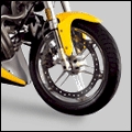 Recently a new design of rim mounted brake discs have also been available to the public and can be seen on oem motorcycles such as the new Buells. These discs offer some more excellent characteristics such as a much larger surface area offering greater cooling efficiency, larger swept area offering a much more long wearing and powerful brake, a zero torsional load and significantly reduces unsprung weight.